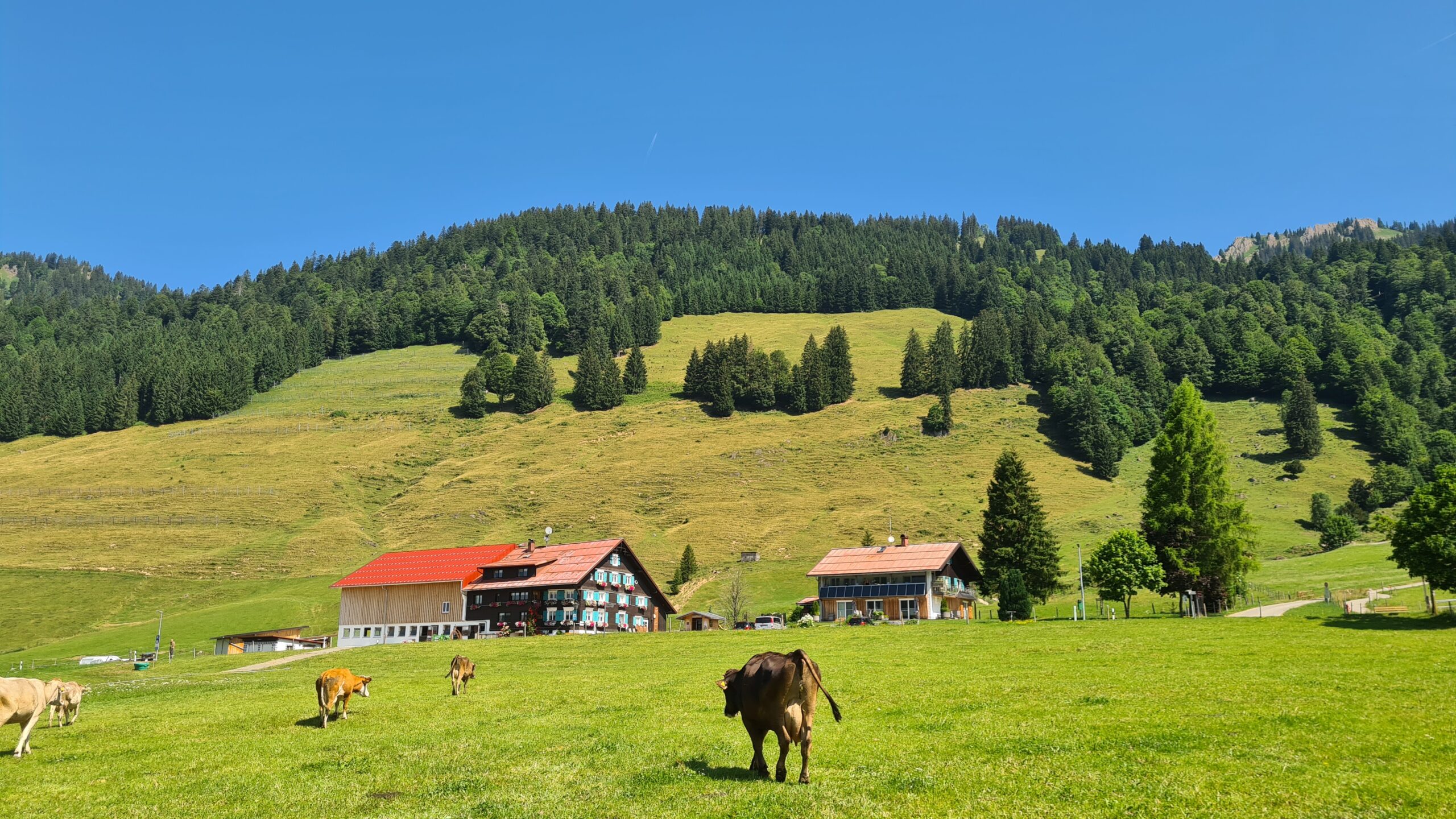 Während der Alpzeit im Sommer werden täglich zweimal Kühe gemolken und aus der Milch wird leckeren Bergkäse, Joghurt und Butter gemacht. Ganzjährig wohnen bei uns Rinder und Kälber, unser Noriker Hella und ein paar Katzen.